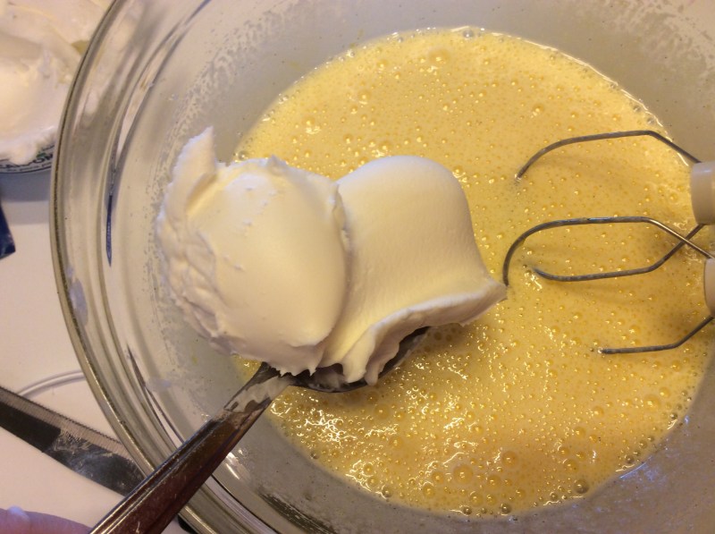 Continuo a montare poi ammorbidisco con una spatola il mascarpone e lo aggiungo poco per volta al composto di uova continuando a montare