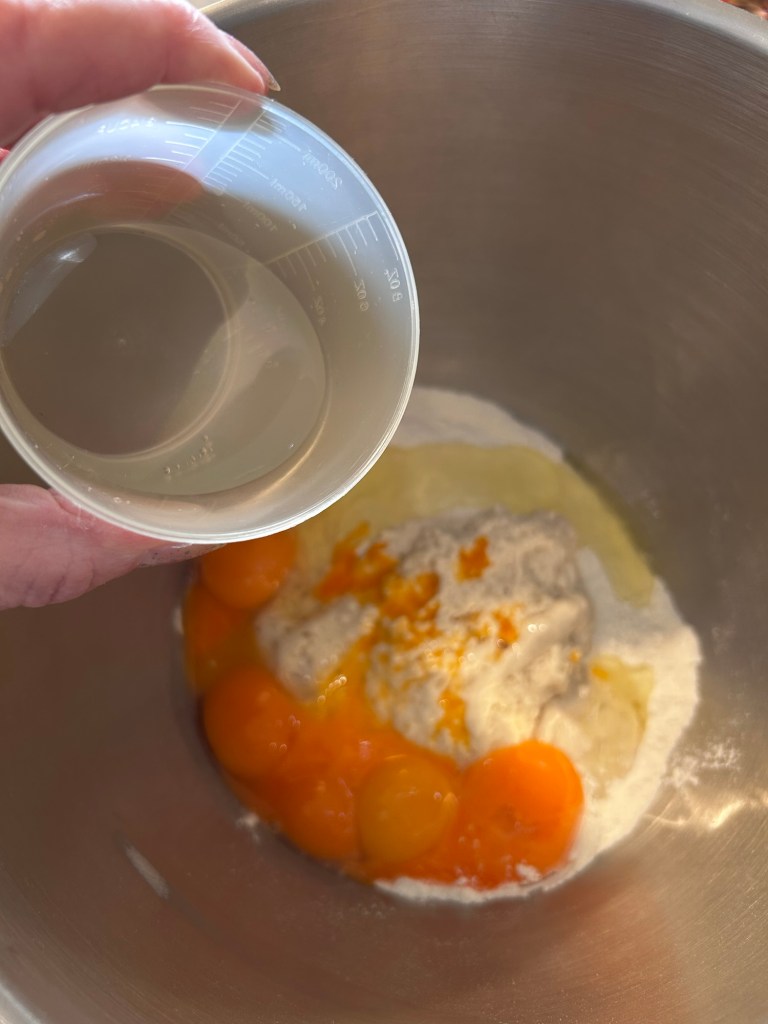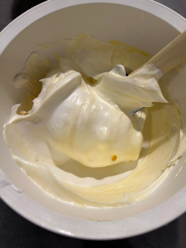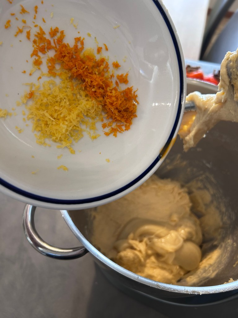 Aggiungo il sale, quando é incorporato aggiungo l’emulsione che avevo tolto dal frigorifero e la buccia degli agrumi