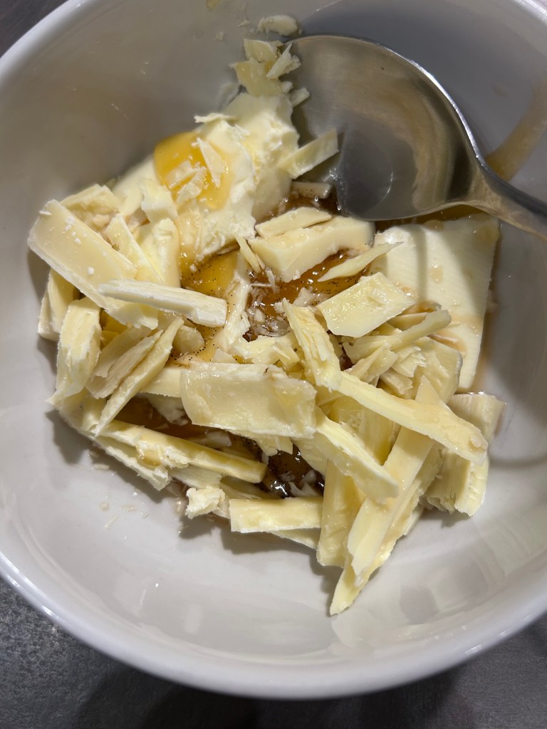 La sera prima sciolgo il cioccolato bianco con il burro, aggiungo il miele e il Marsala