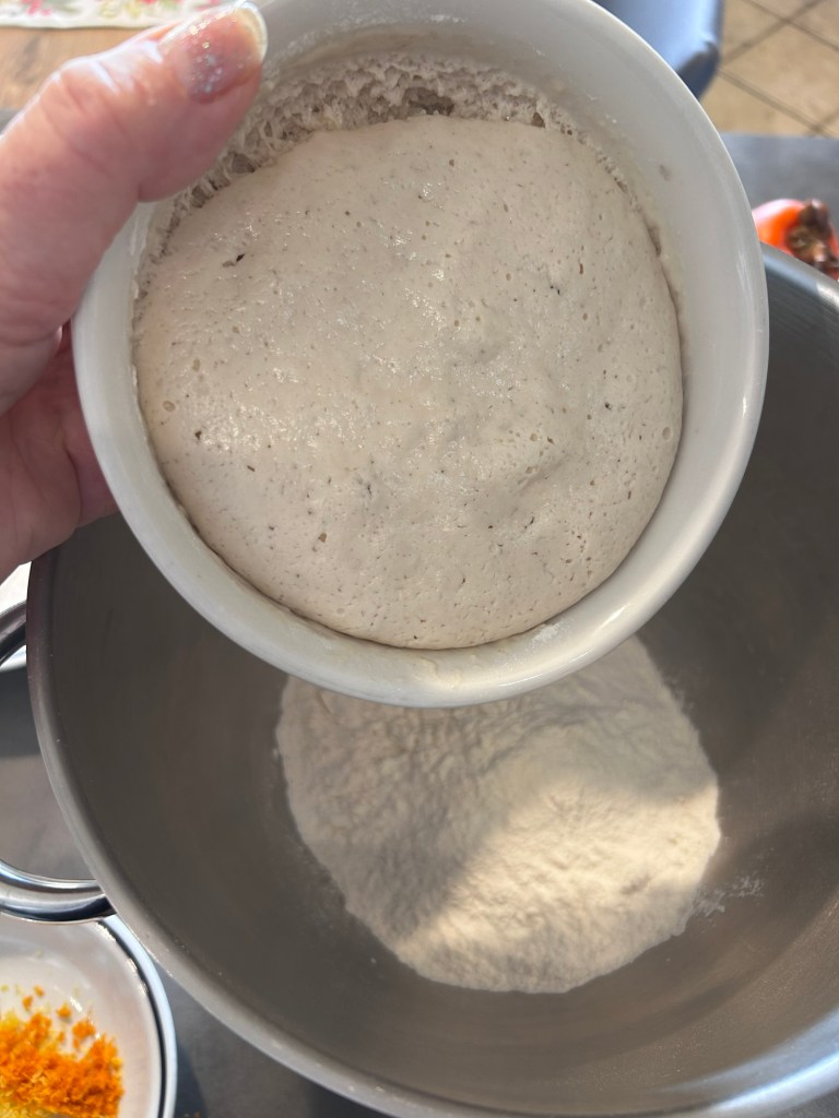Il giorno seguente iniziate al mattino, tolgo l’emulsione dal frigorifero preparo il lievitino, sciolgo il lievito nel latte tiepido, aggiungo la farina e lo zucchero
