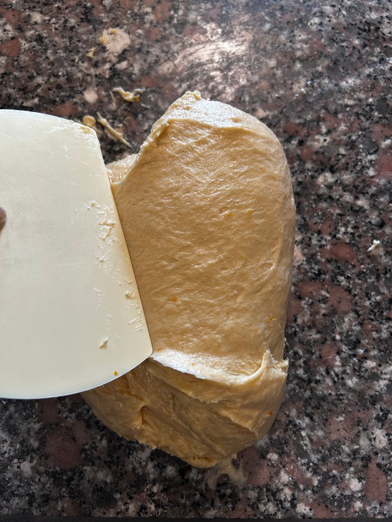 Lascio lavorare per 10/15 minuti finché l’impasto é ben incordato, nel frattempo imburro lo stampo e il piano di lavoro, verso l’impasto e le do alcune pieghe, laterali poi lo giro e altre pieghe