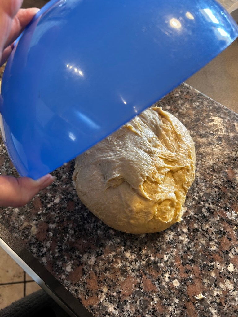Ripeto le pieghe e metto l’impasto nello stampo, lo copro con pellicola e ripongo in forno spento con la luce accesa per 6 ore deve arrivare al bordo, il mio avendo lo stampo un po’ piccolo dopo 5 ore e mezzo era già molto lievitato