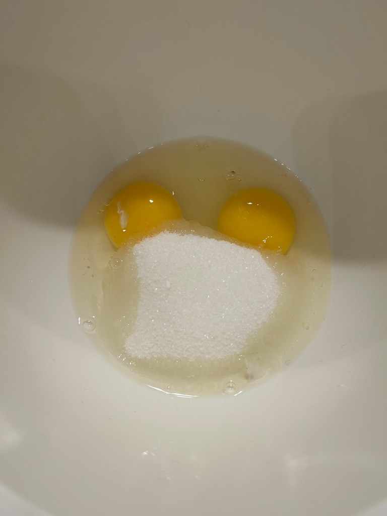In una ciotola rompo le uova e aggiungo lo zucchero