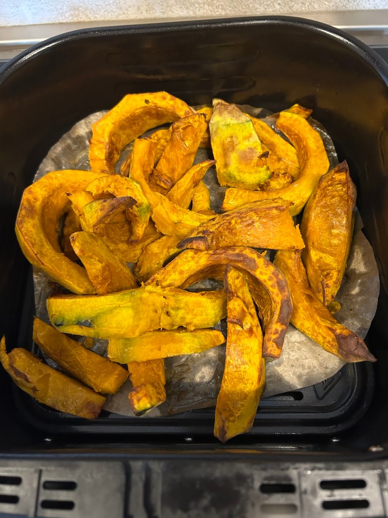 La taglio a fette la cuocio in friggitrice ad aria o nel forno classico con un filo di olio, sale, pepe per circa 20 minuti a 180 gradi o finché risulta tenera