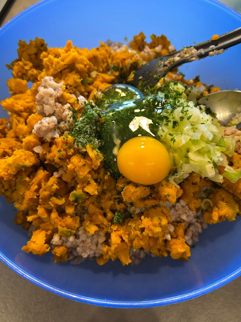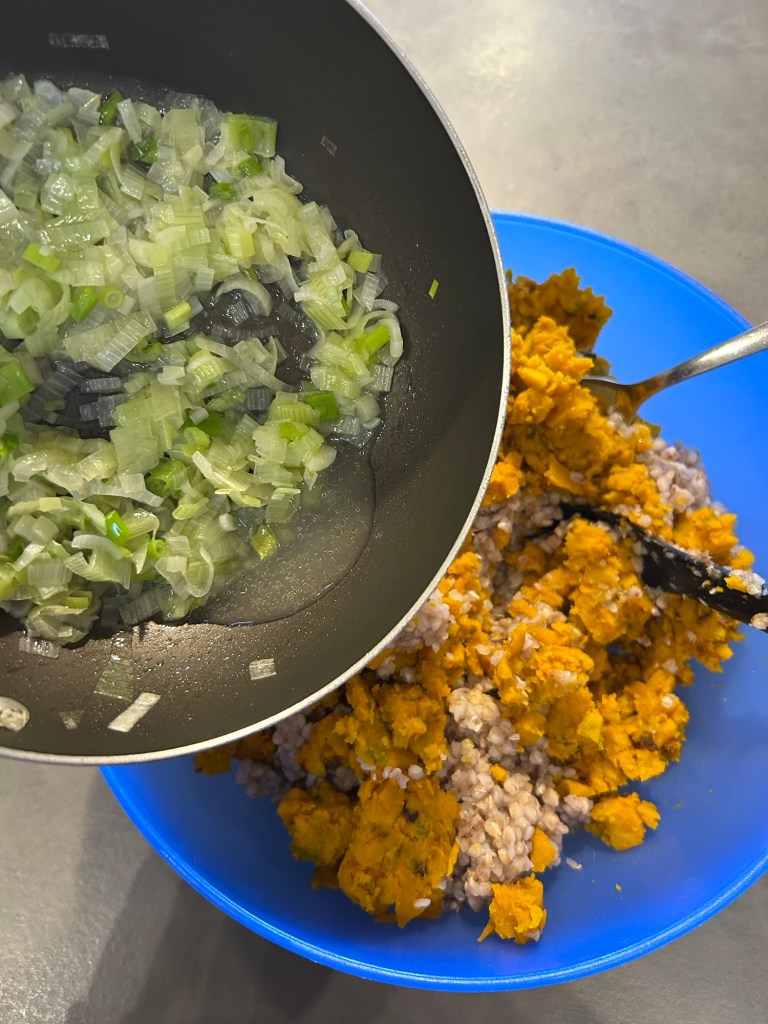 In una ciotola verso il grano saraceno cotto, la zucca tritata, il cipollotto
