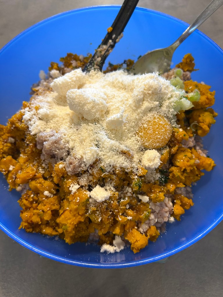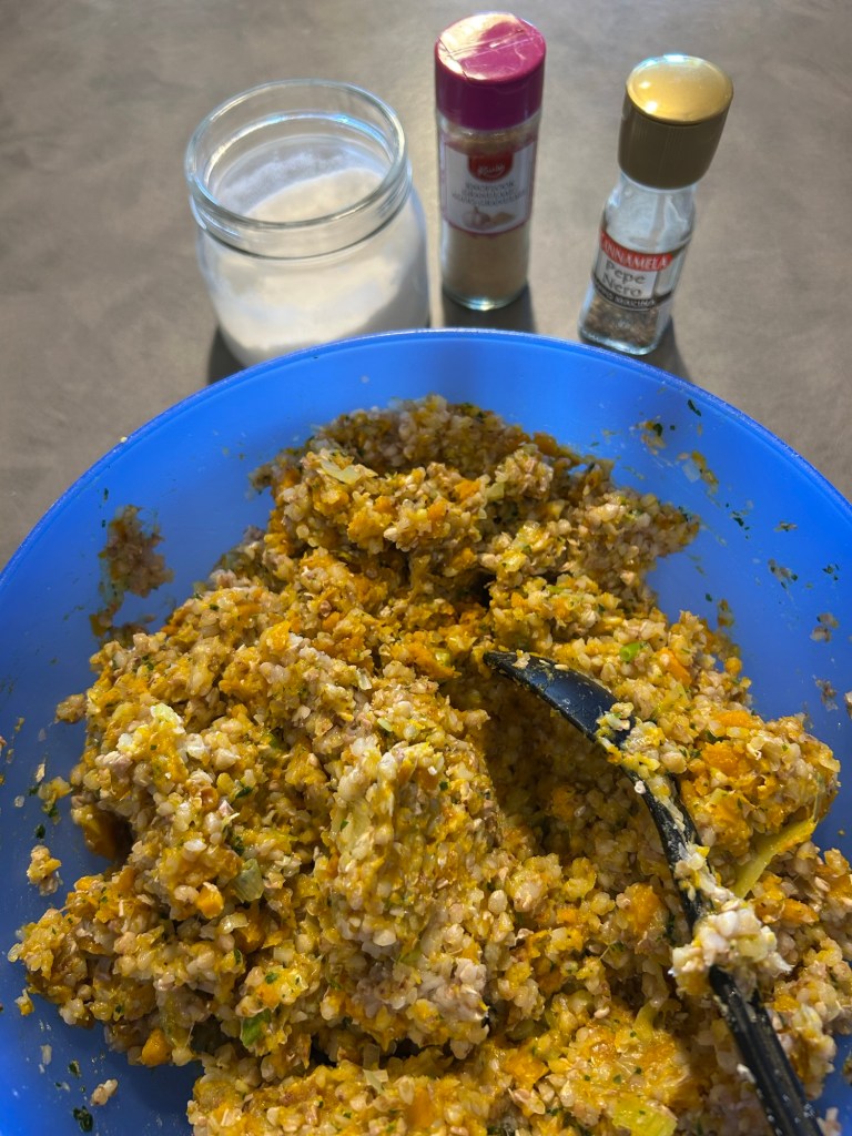 Mescolo, regolo di sale, pepe e se vi piace dell’aglio in polvere o fresco e amalgamo bene, deve risultare un impasto morbido