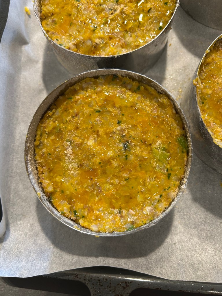 Ungo dei coppa pasta poi li passo nel pane grattugiato e inserisco l’impasto pressando bene, cospargo di pane grattugiato e infilo di olio, tolgo il coppa pasta e cuocio in forno caldo a 180 gradi per 20 minuti