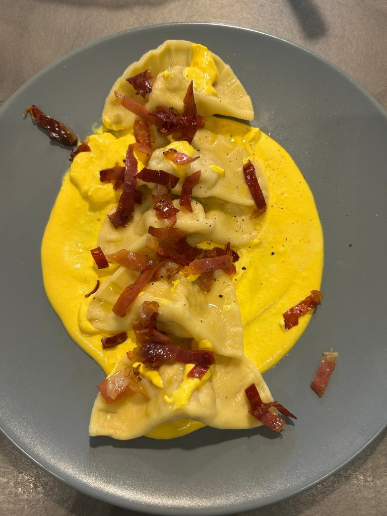 “GIRELLE DI PASTA FRESCA CON RICOTTA E SPECK SU CREMA DI ZAFFERANO”