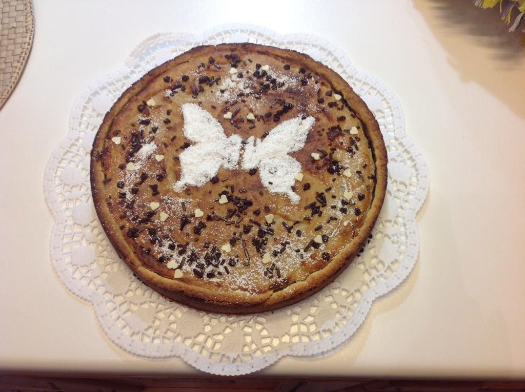 Decoratela a piacere con zucchero a velo o codette di cioccolato potete fare anche le strisce con la pasta prima di infornare come una normale crostata