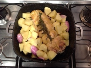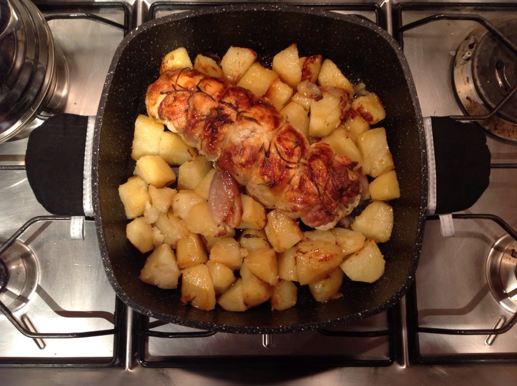 In una teglia da forno ho messo dell’olio extravergine ho rosolato il pollo e sfumato con vino bianco. Ho aggiunto le patate a pezzi grossi qualche rametto di rosmarino e alcuni scalogni, ho finito la cottura in forno a 180 gradi per 40 minuti circa.