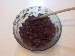 Unisco il resto dei corn flakes e i pistacchi tritati al cioccolato fuso mescolando bene l’impasto resterà un po’ sgranato si compatterà raffreddando