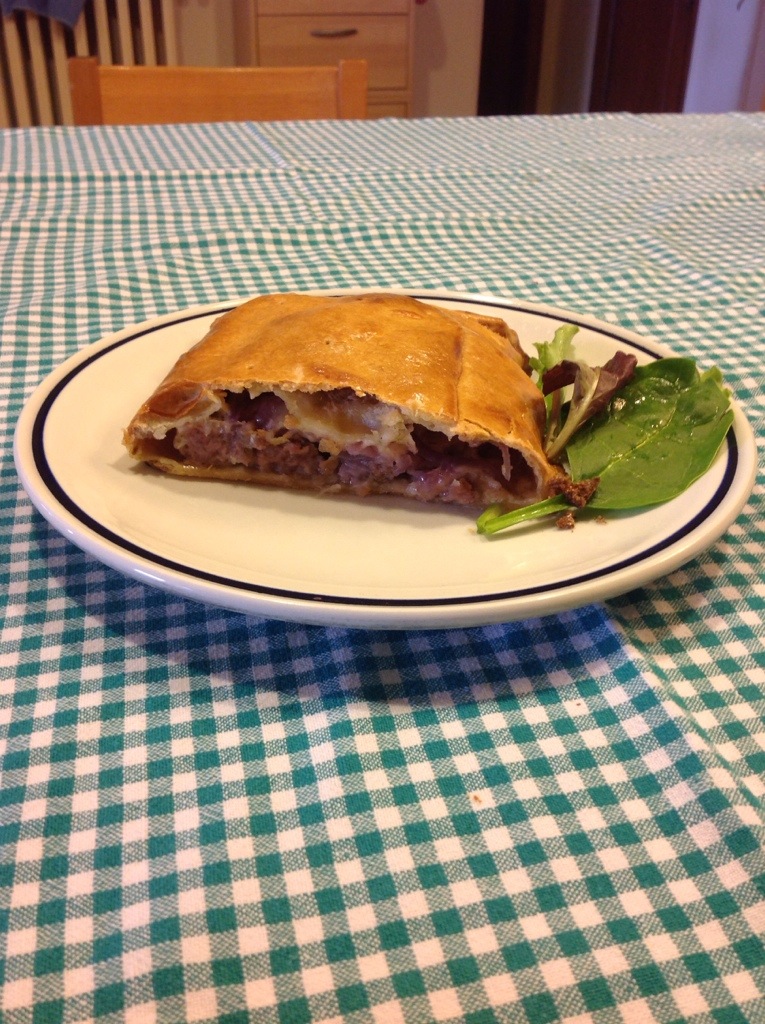 Spennelllare tutto il bordo della pasta con l’albume sbattuto chiudere come uno strudel sigillando bene i bordi. Spennellare lo strudel con il tuorlo battuto con il latte e il sale