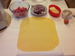 Prendere la pasta stenderla sulla spianatoia infarinata fino a d ottenere una sfoglia sottile cercate di dare una forma rettangolare.