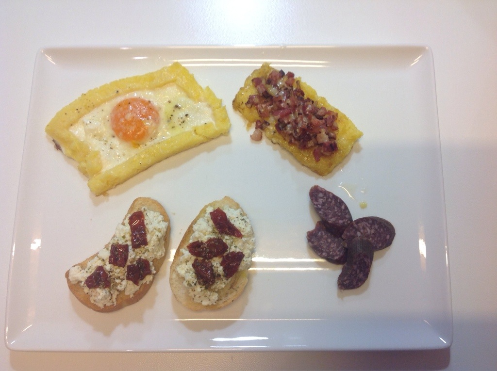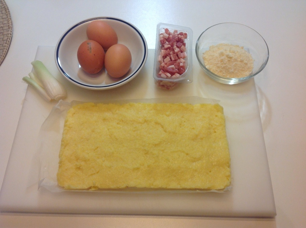 Ho tagliato dei rettangoli di polenta togliendo il quadrato al centro , ho preso una pentola antiaderente appena unta di olio l’ ho scaldata e ho appoggiato delicatamente i quadrati bucati