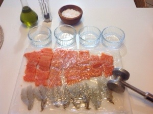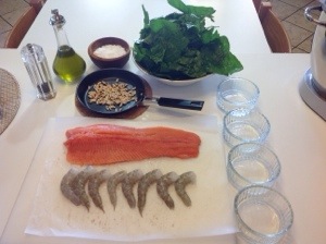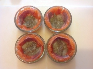 Mettete sul fondo di ogni stampo 2 gamberi , rivestire le pareti con la trota