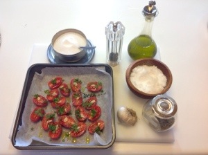 In una teglia coperta di carta forno mettere i pomodorini tagliati a metà , un pizzico di zucchero , sale , pepe , timo , prezzemolo , origano e un filo di olio
