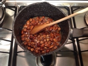 Solo allora mettete le mandorle e le nocciole e iniziate a mescolare con un cucchiaio di legno