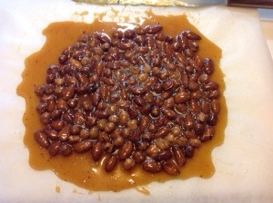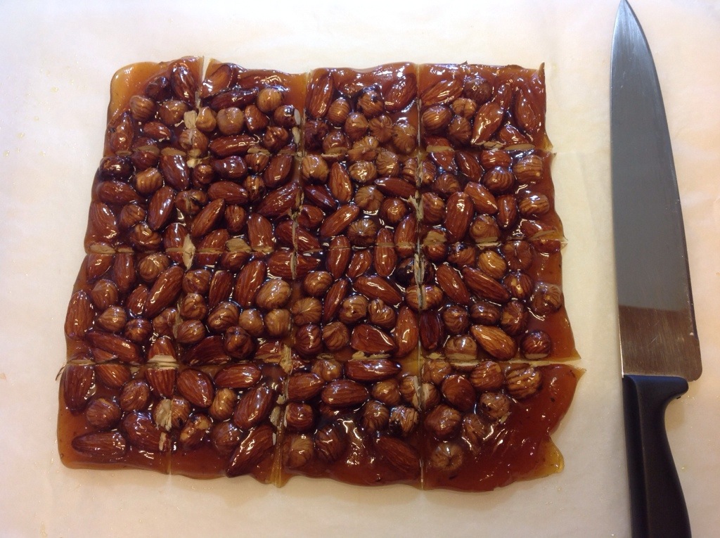 Poi con pazienza cercate con la spatola di appiattirlo e stringete il caramello vicino alla frutta secca cercando di dare una forma rettangolare