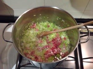 Metto un po’ di olio in una pentola aggiungo il trito e lascio imbiondire