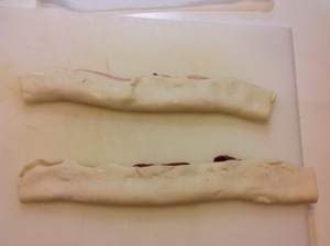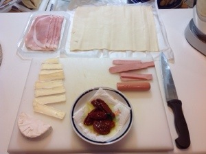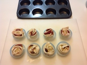 Arrotolo la striscia su sé stessa come a formare una rosa, preparo così tutte le strisce variando gli ingredienti