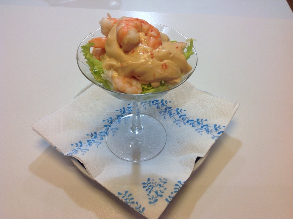 Prendete delle coppe tipo Martini o da spumante fate un fondo di insalata facendola uscire ai bordi Suddividete la salsa con i gamberi e sopra mettetene uno come decorazione