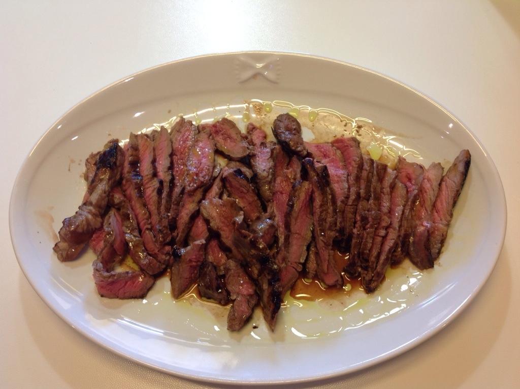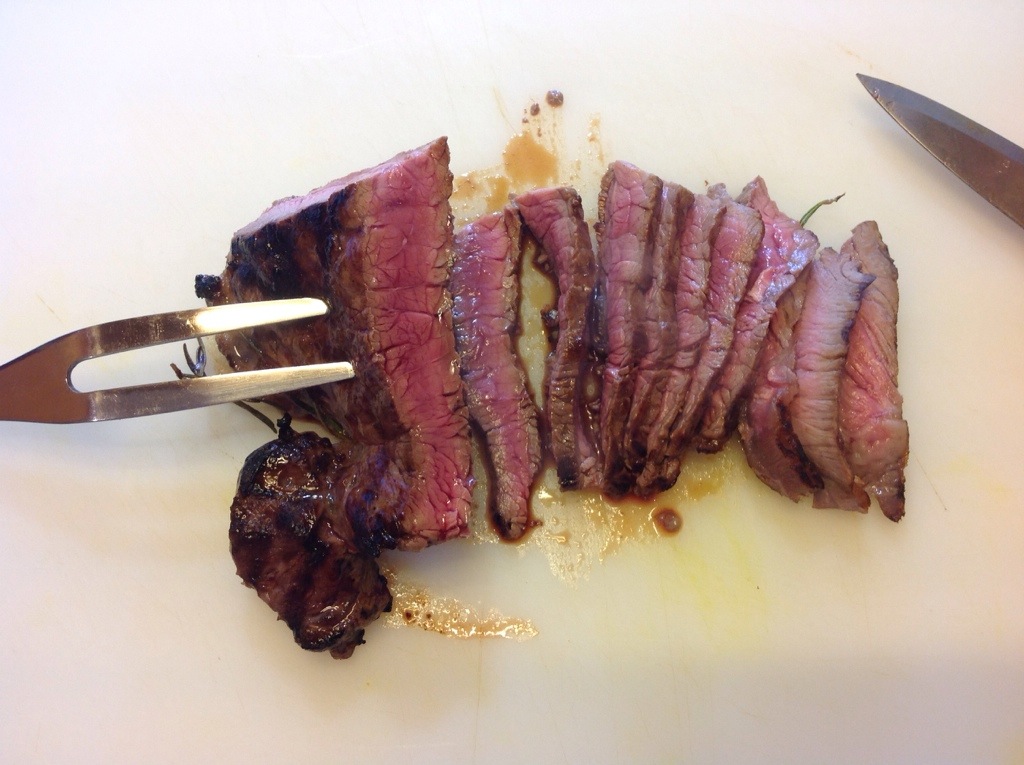 Quando è cotta appoggiatela su un tagliere, fatela riposare un paio di minuti e con un coltello affilato tagliatela a fettine sottili in modo obliquo, deve essere cotta fuori e rosata all’interno