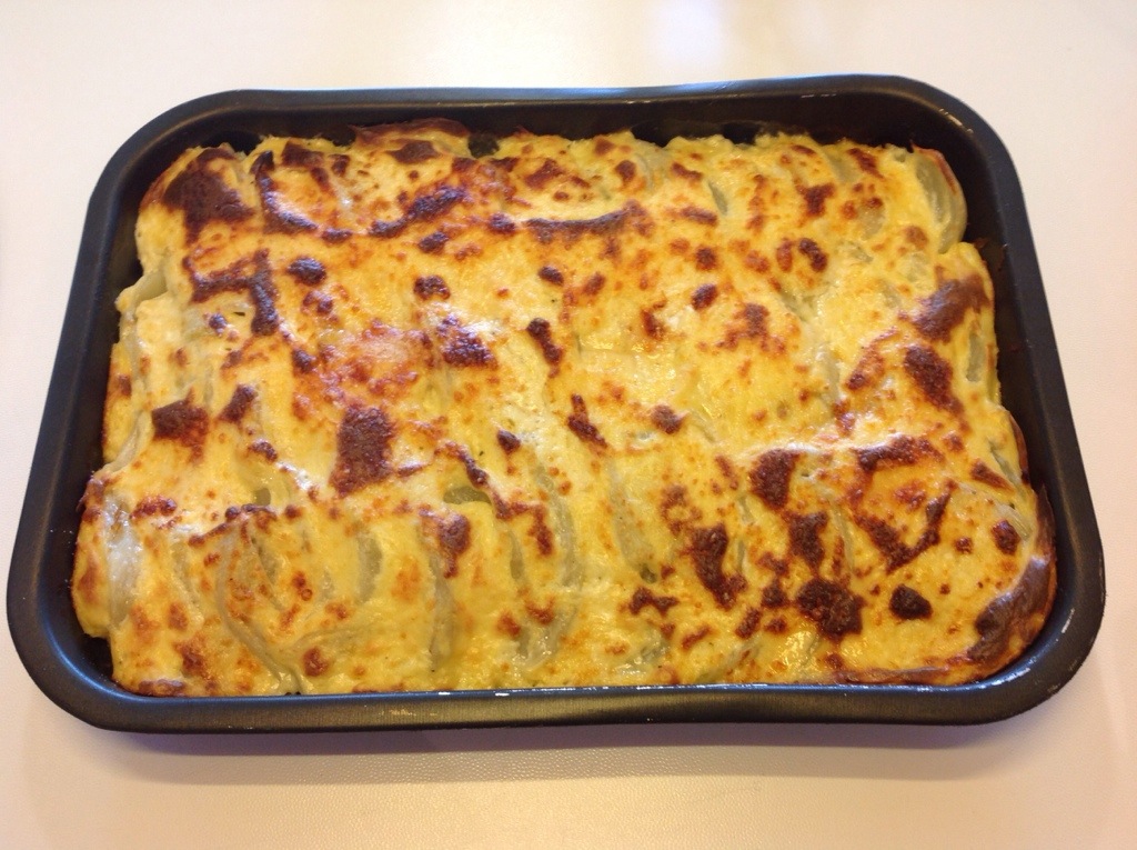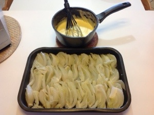 Scolo bene i finocchi li tampono per togliere residui di acqua, li dispongo molto ravvicinati in una teglia imburrata in un solo strato