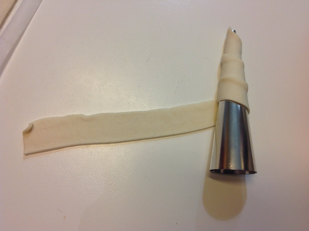 Inizio ad arrotolare la sfoglia sui cannoli di acciaio partendo dalla punta sovrapponendola leggermente