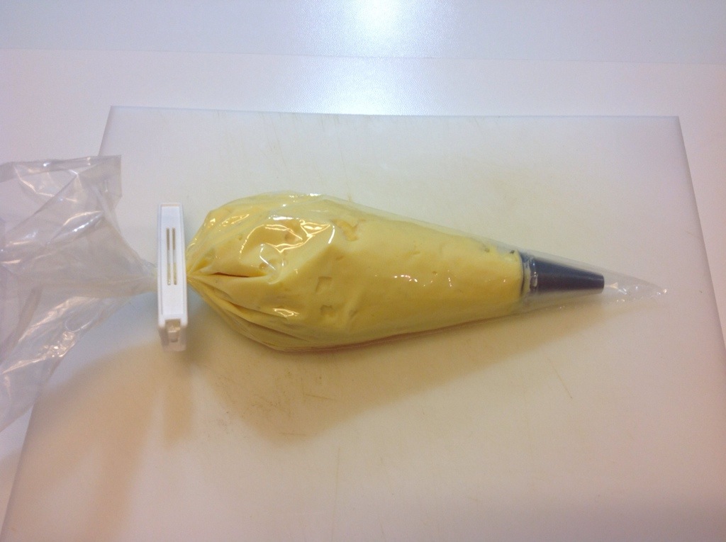 Metto la crema pasticcera precedentemente preparata e fredda in un sac a poche con la bocchetta liscia