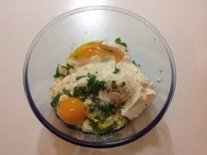 In una terrina mescolo la ricotta, i tuorli, il grana, il basilico sminuzzato sale, pepe