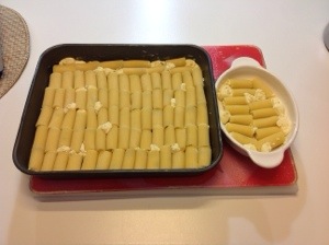 Inizio a riempire la pasta una ad una, la allineo nella placca da forno