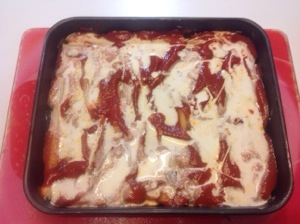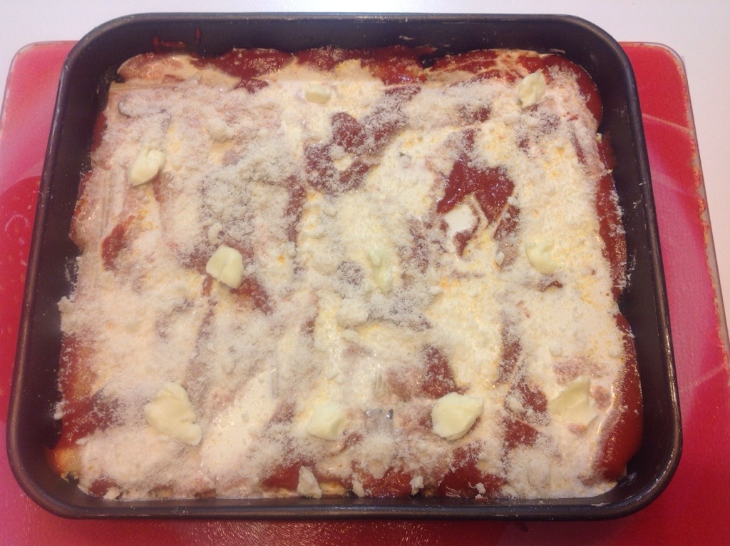 Quando la teglia è completa verso la salsa di pomodoro