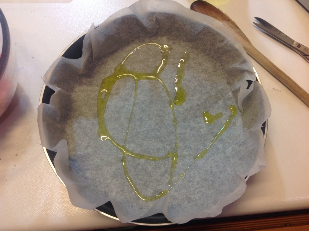 Rivesto una tortiera di carta forno, la ungo leggermente