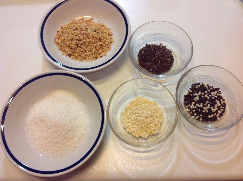 Codette colorate, cocco grattugiato, granella di mandorle o nocciole a piacere
