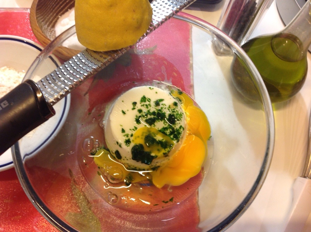 In una ciotola unisco ricotta, uova, prezzemolo, la buccia grattugiata di mezzo limone