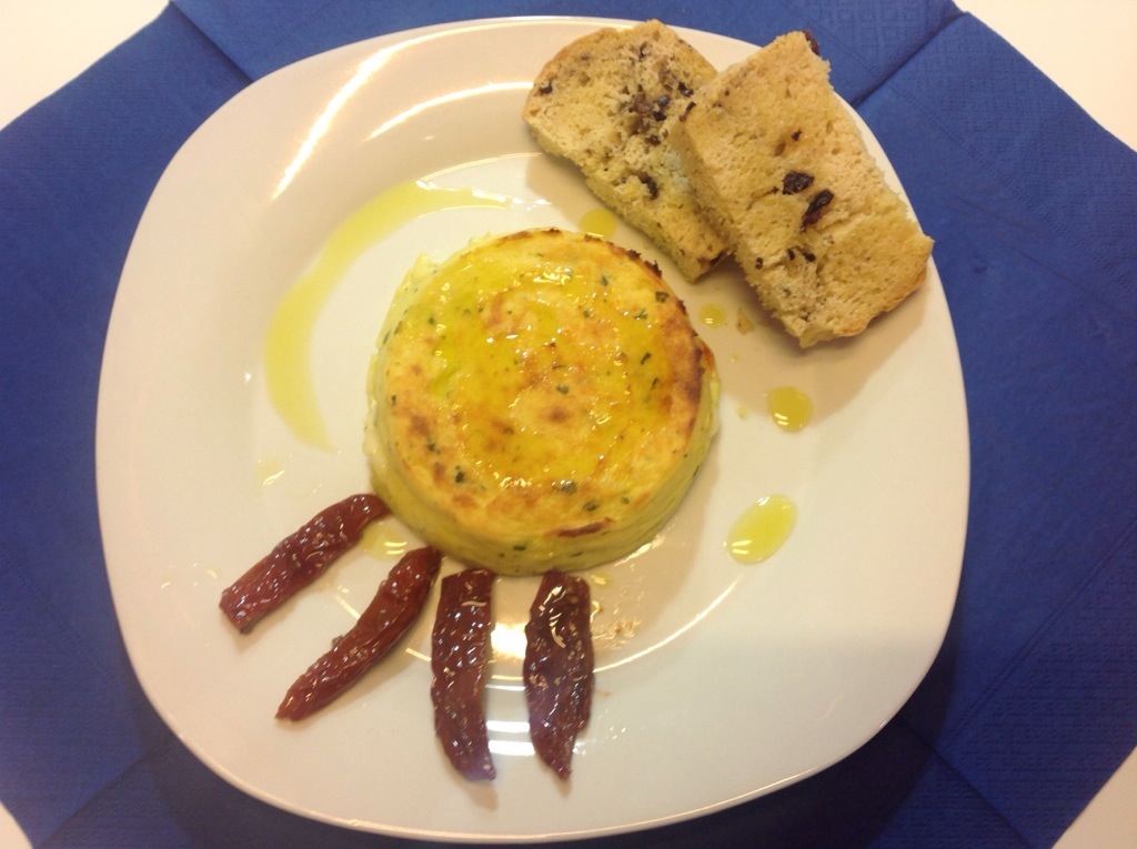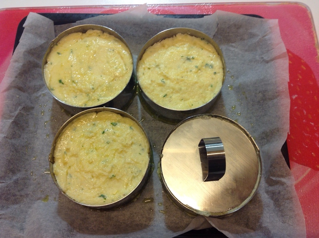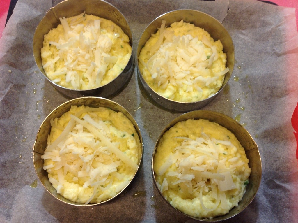 Divido metà dell’impasto nei 4 stampi e suddivido il formaggio grattugiato a scaglie