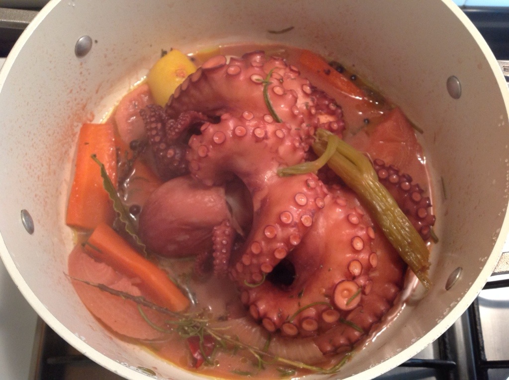 Lavo bene il polpo sotto l’acqua fredda, tolgo con un coltellino l’occhio