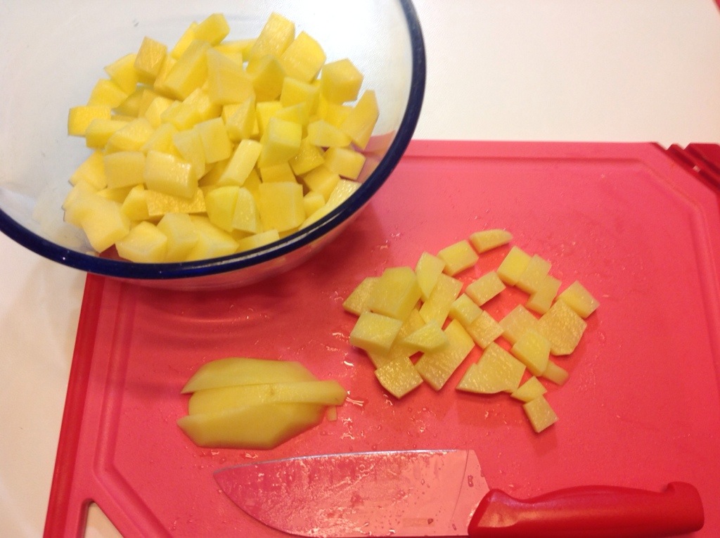 Preparo anche delle patate lesse, per sveltire la cosa le sbuccio e le taglio a cubetti