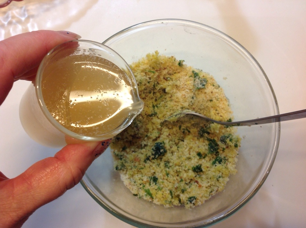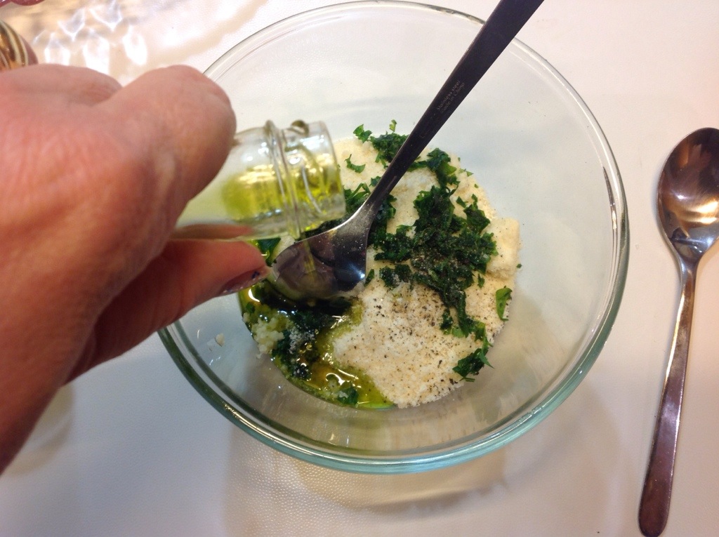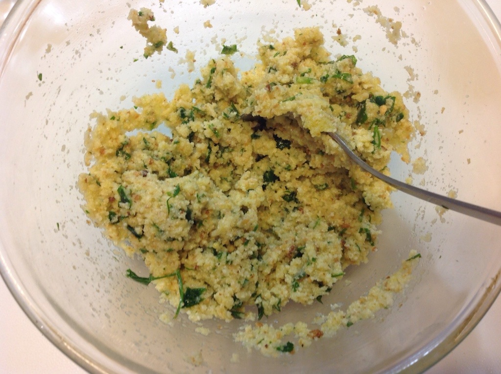 Mescolo insieme il pane, il formaggio, il prezzemolo, sale, pepe, lo spicchio di aglio tritato e un po’