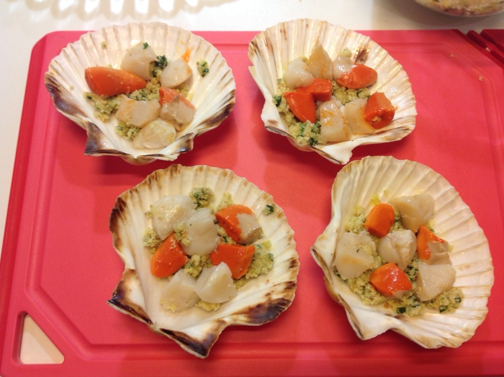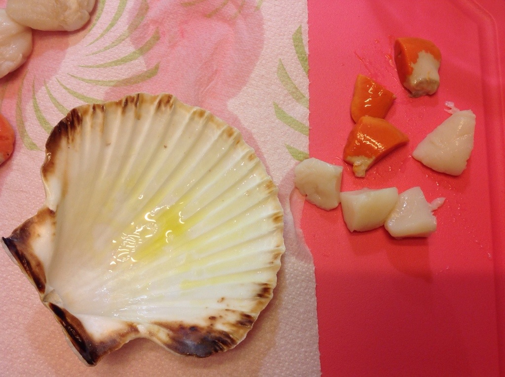 Nel frattempo lavo molto bene le capesante e le asciugo, lavo anche le conchiglie e le ungo con un goccio di olio, taglio le capesante a pezzetti ( la noce bianca in 4, il corallo in 3)