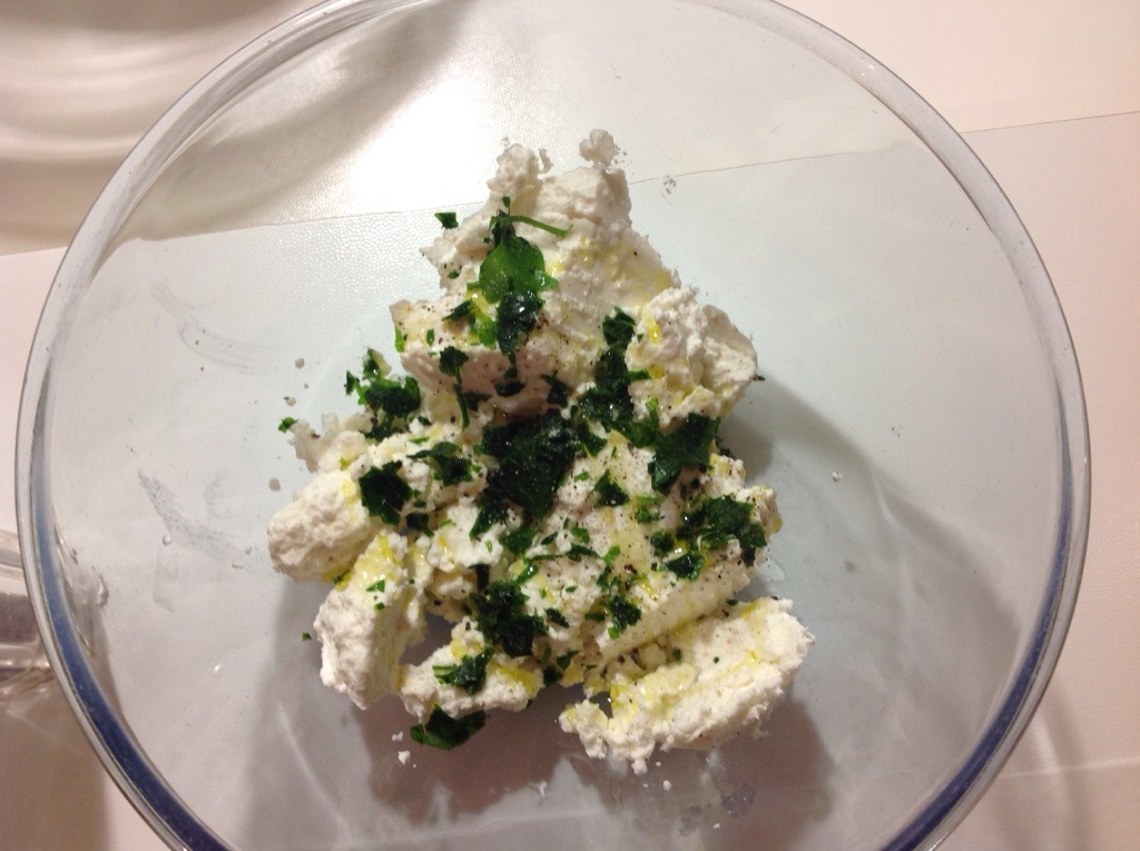Lavoro la ricotta in una ciotola con pepe, sale, e olio extravergine e amalgamo bene