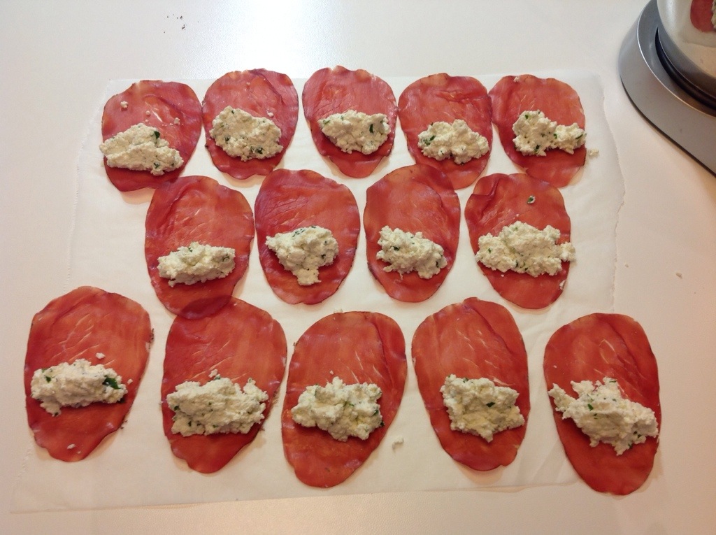 Dispongo le fettine di bresaola e distribuisco un pochino di impasto su ogni fettina e arrotolo