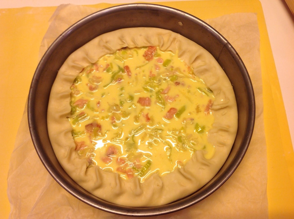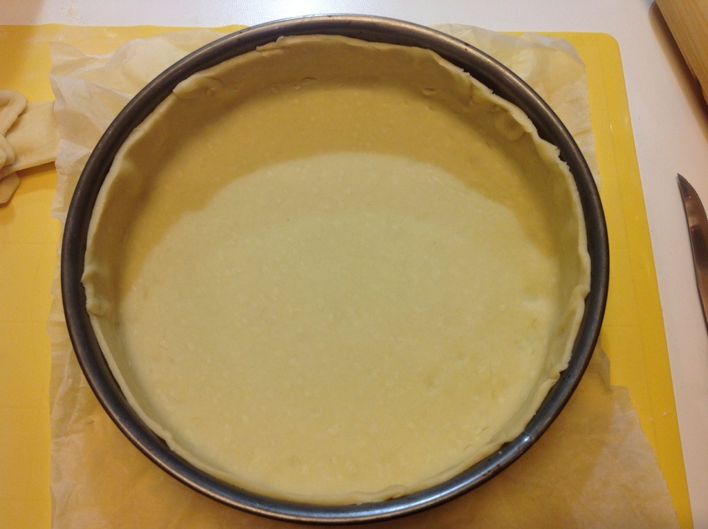 Rivesto una teglia di 26 cm di diametro con la carta forno e la rivesto con la briseé, lasciando un bordo di 3 cm circa