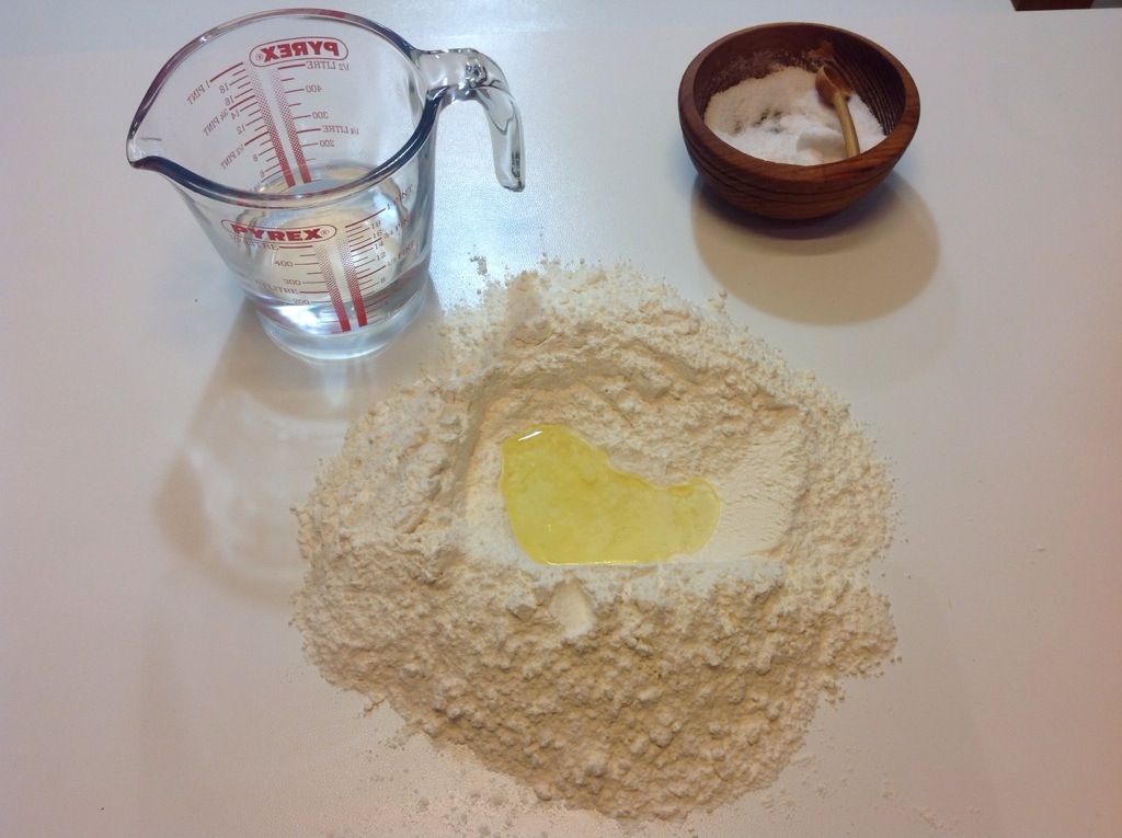 Al centro della spianatoia metto la farina a cratere, aggiungo il sale, l’albume e poco per volta l’acqua