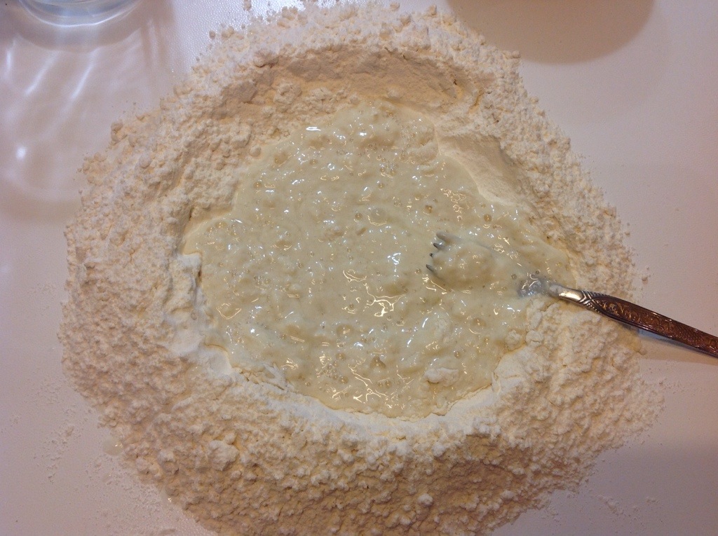 Con una forchetta mescolo incorporando poco per volta acqua e farina, non ho dato le dosi dell’acqua perché ogni farina assorbe in modo diverso