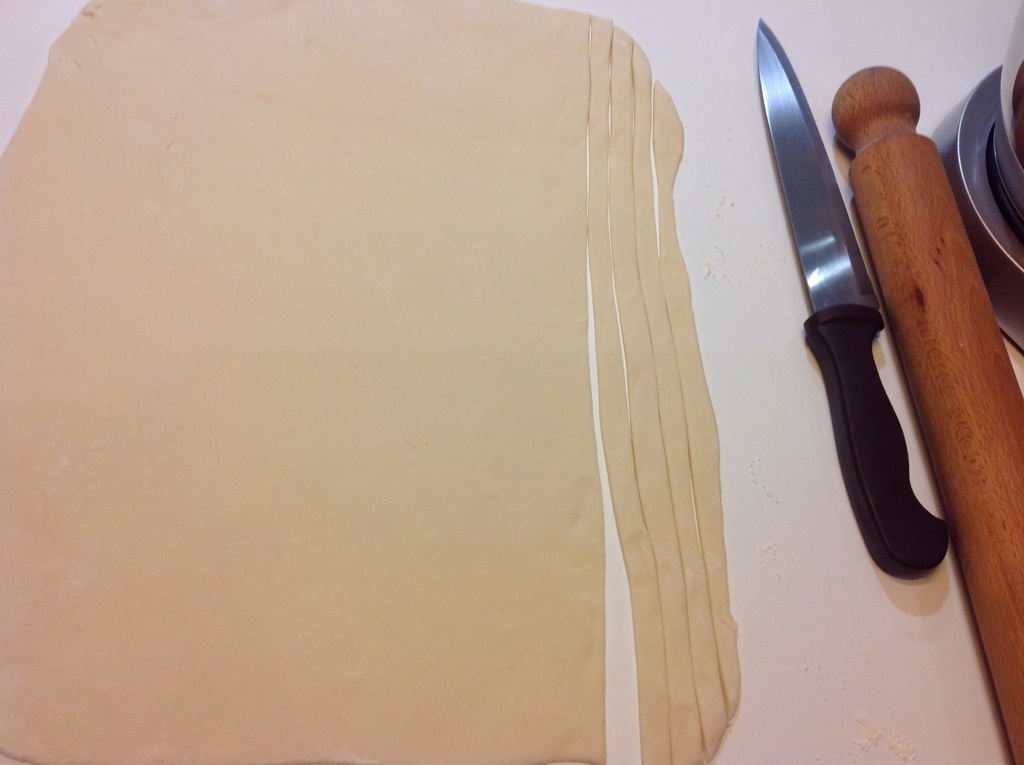 Con un matterello la tiro dello spessore di 2/3 mm dandole una forma rettangolare e con un coltello taglio delle strisce larghe 1 cm 1 cm e mezzo