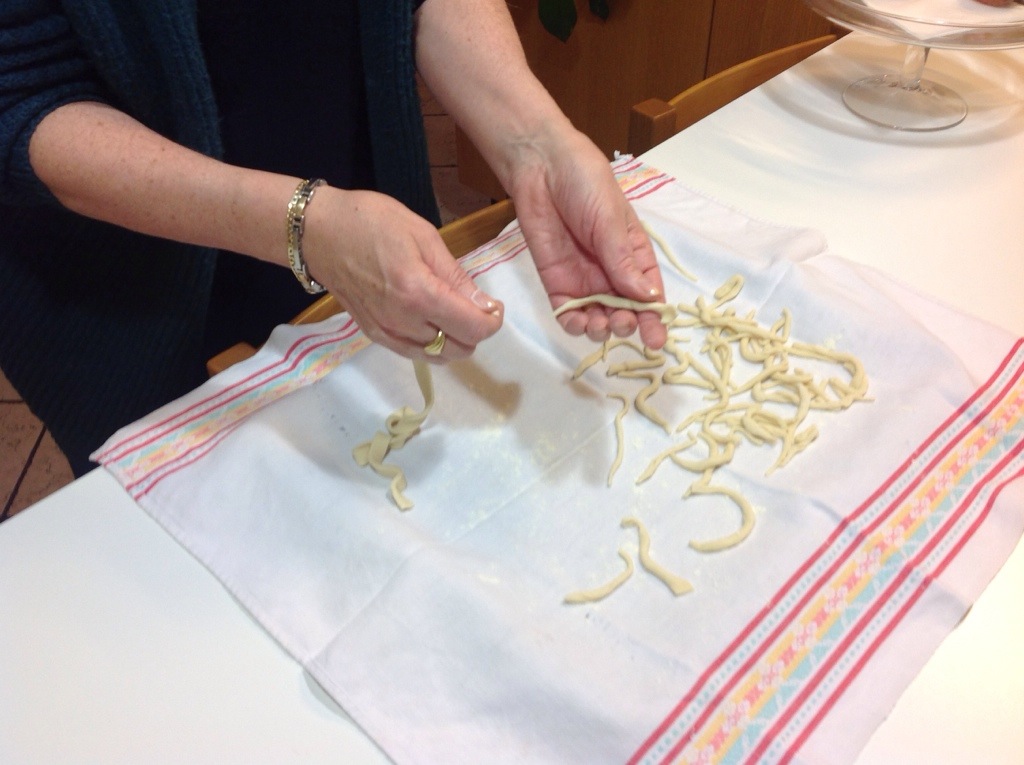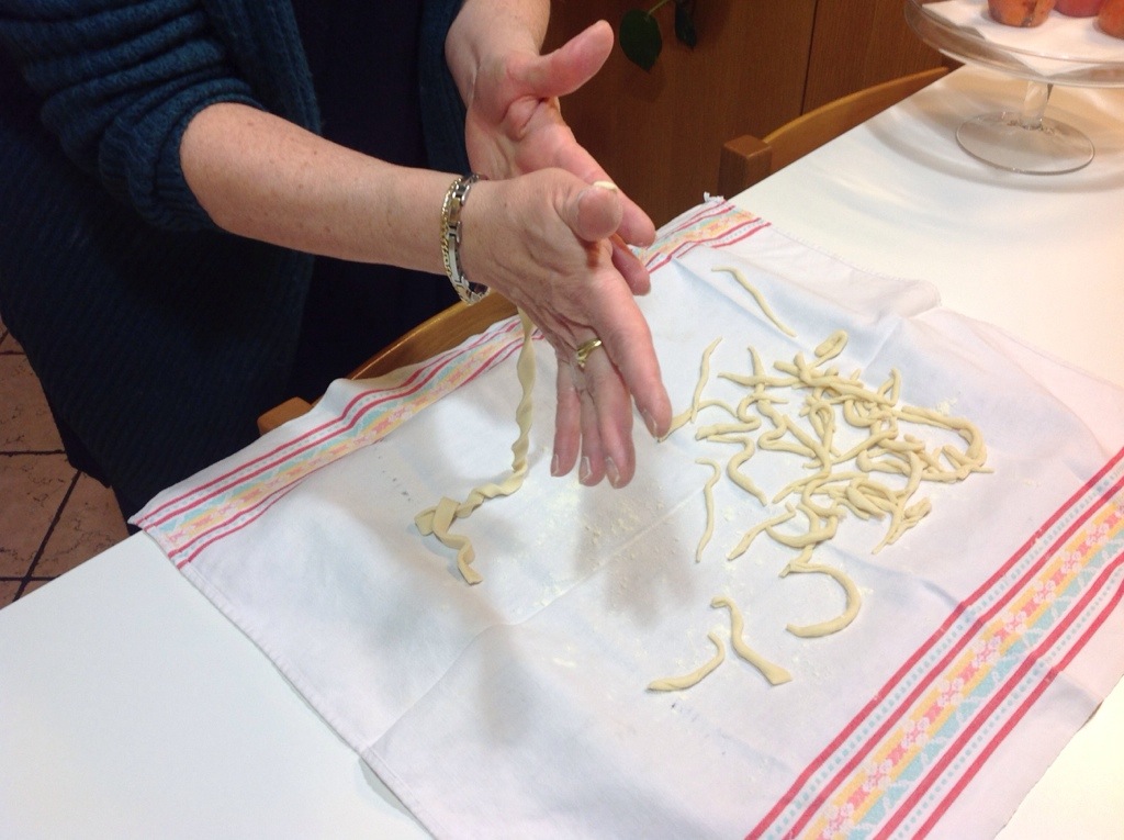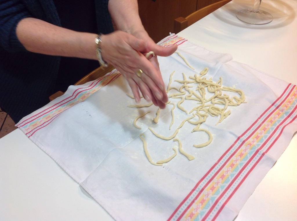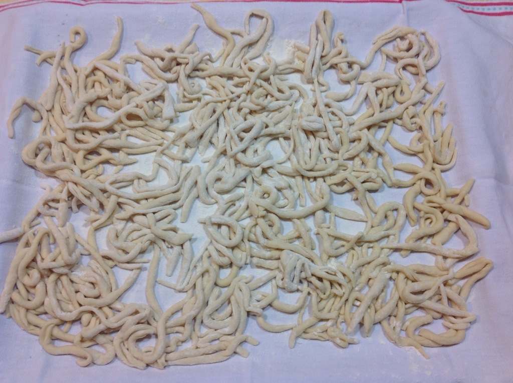 Prendo in mano una striscia e la arrotolo fra le mani come se le stessi sfregando e spezzo gli strozzapreti della lunghezza di circa 8 cm, non ha importanza se sono irregolari, li lascio cadere su un canovaccio infarinato