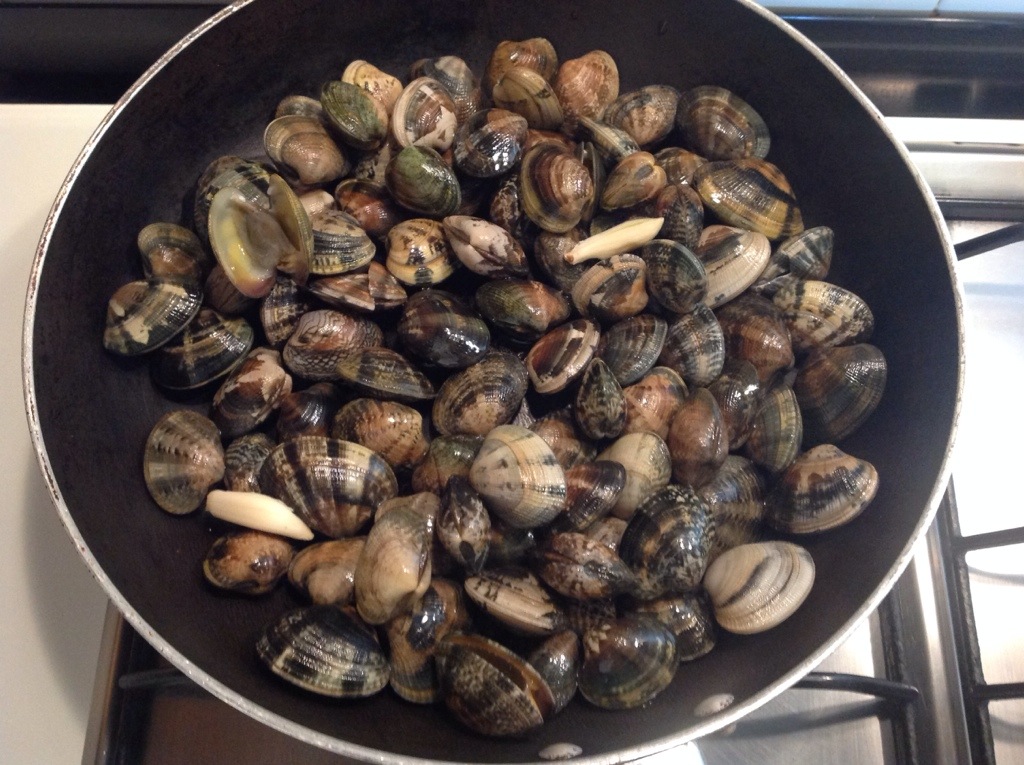 Scaldo una padella aggiungo un goccio di olio, uno spicchio di aglio e verso le vongole, copro con un coperchio e le lascio aprire a fuoco vivace