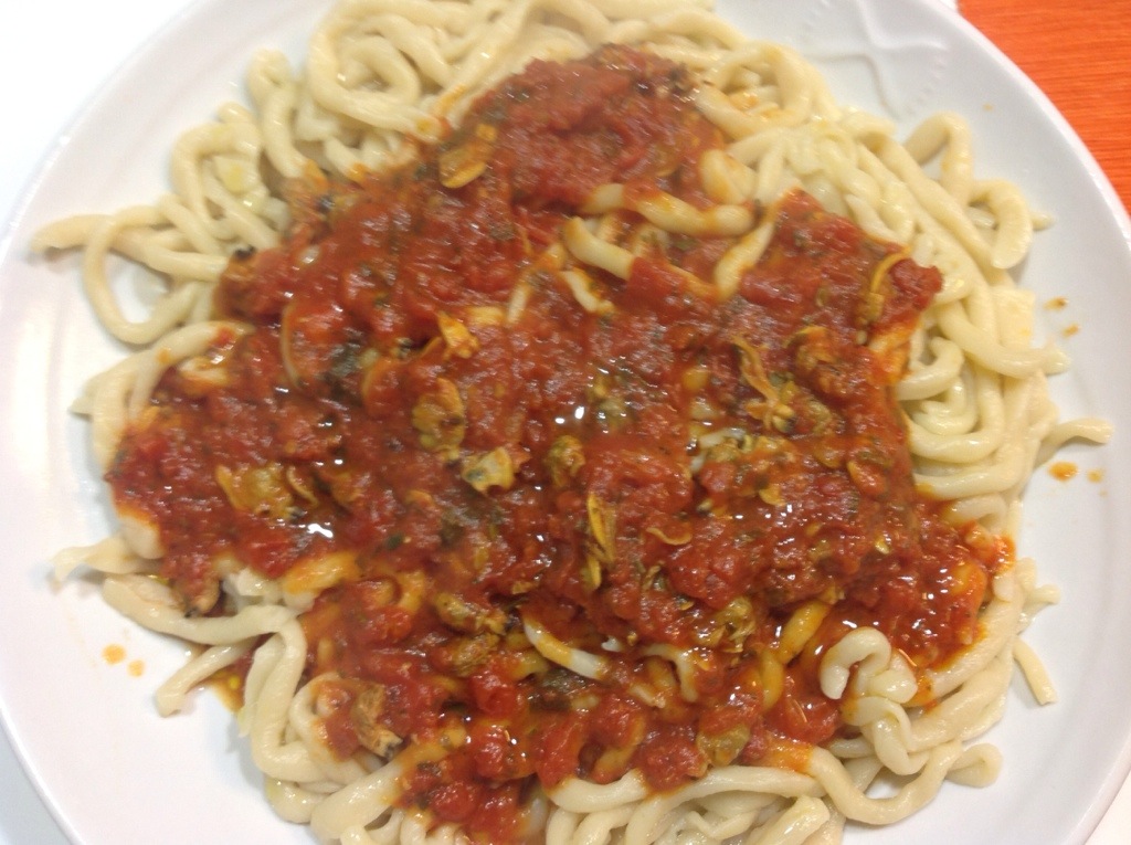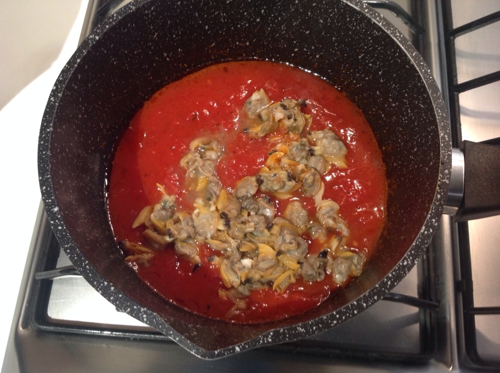Preparo un sugo di pomodoro facendo soffriggere in un po’ di olio due spicchi di aglio e un pezzetto di peperoncino, lascio restringere e aggiungo le vongole