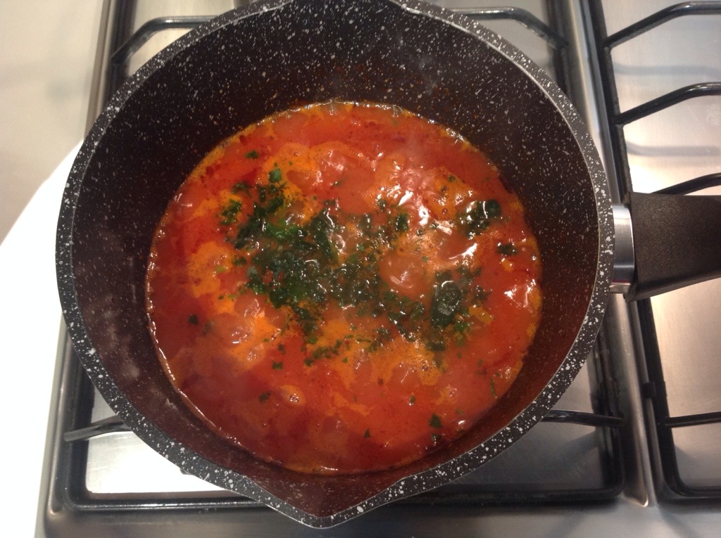 Aggiungo qualche cucchiaio di acqua filtrata e prezzemolo tritato, assaggio il sugo prima di salare perché l’acqua delle vongole è già salata cuocio il sugo per una decina di minuti